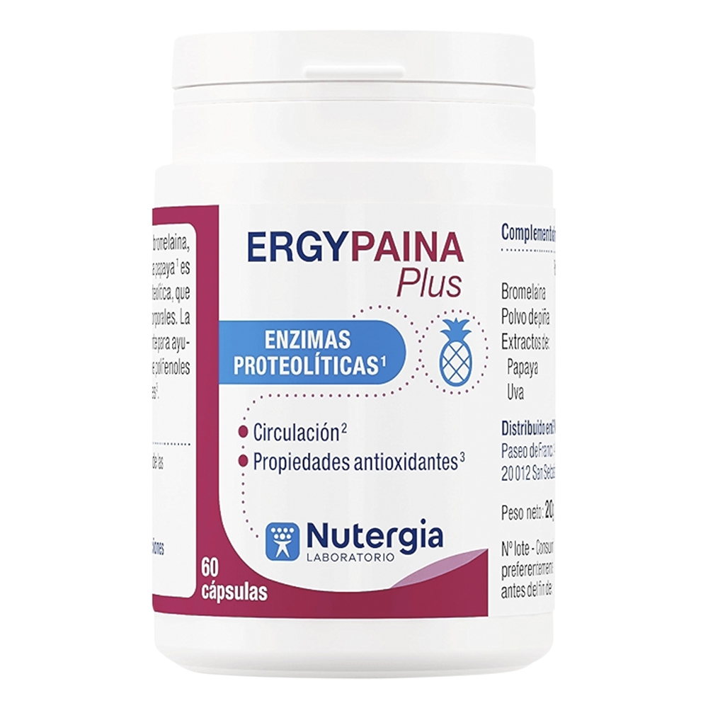 ERGYPAINA Plus é um suplemento alimentar à base de Bromelaína, Mamão, Abacaxi e Uva.
